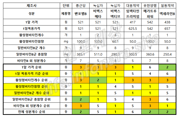 - 종근당 벤포벨B는 전 부문이 고르게 상위권에 분포되어 있고, 그중에 1일 복용 가격 기준 순위, 활성형 비타민 함량 순위, 일반 비타민B군 개수 순위에서는 공동 1위를 차지하고 있습니다.