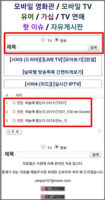 따라서, 한 군데 들어가셔서 해 보시고 안되면 다른 쪽 이용하시면 됩니다. 이용방법은 대동소이한데요. 드라마를 보고싶으실 때는 'TV'를 선택하신후 드라마제목 전부 또는 일부를 넣고 검색하시면 됩니다. 영화를 보고 싶으실때는 '영화'를 선택하시고 검색하시면 되고요.