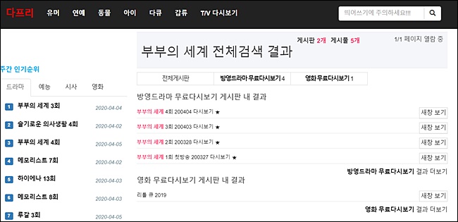 여기서 중요한 점은 '띄어쓰기'를 확실히 해서 검색을 하셔야 합니다. 예를 들어, '부부의세계'라고 붙여 쓰면 검색이 안됩니다. 반드시 '부부의 세계'라고 띄어 쓰시던지 아니면 그냥 '부부의'만 적고 검색하시면 유사 프로그램이 모두 검색됩니다.